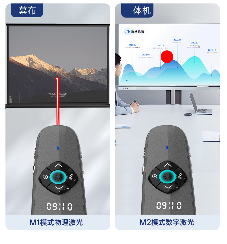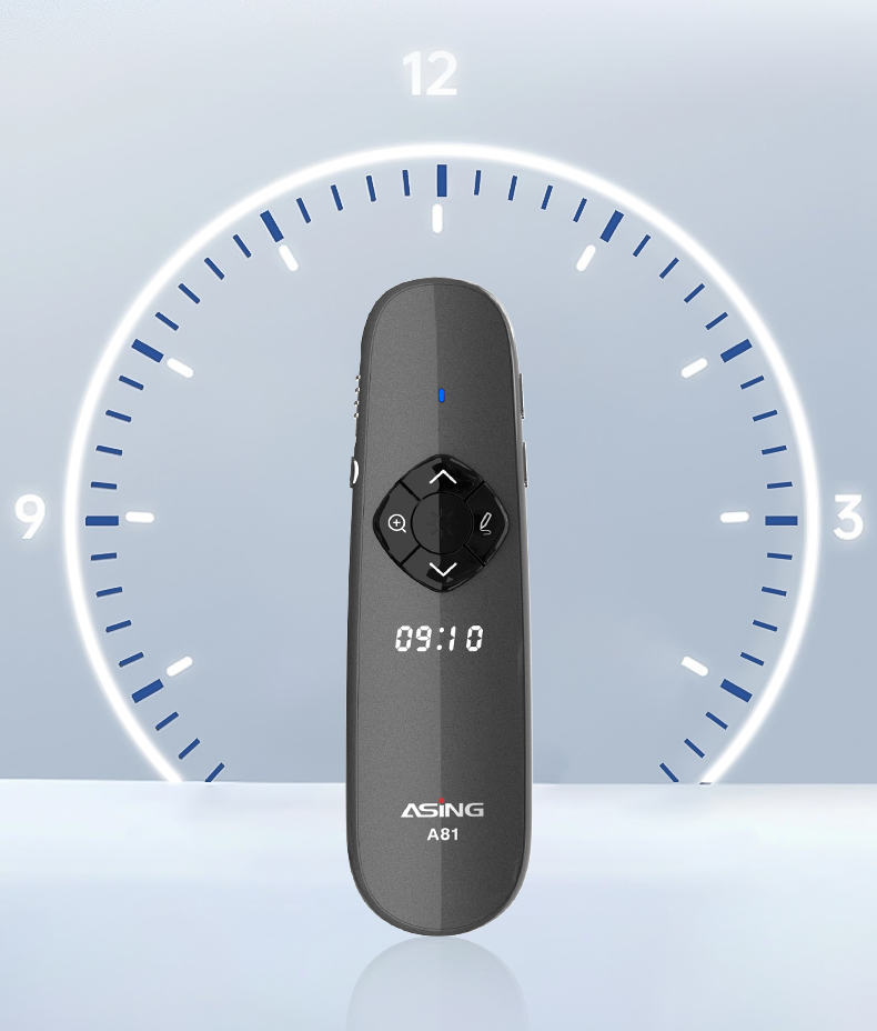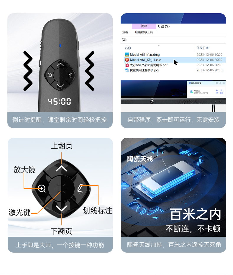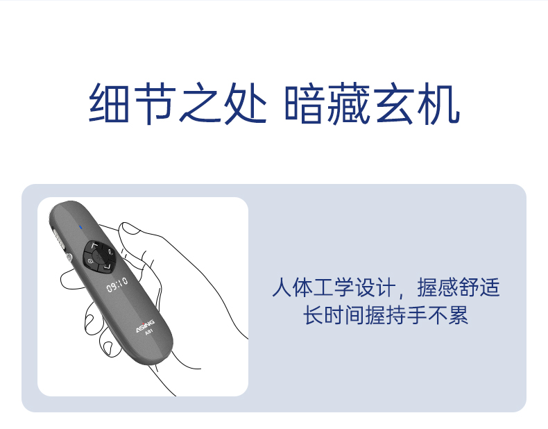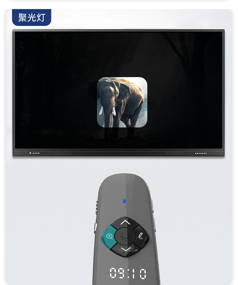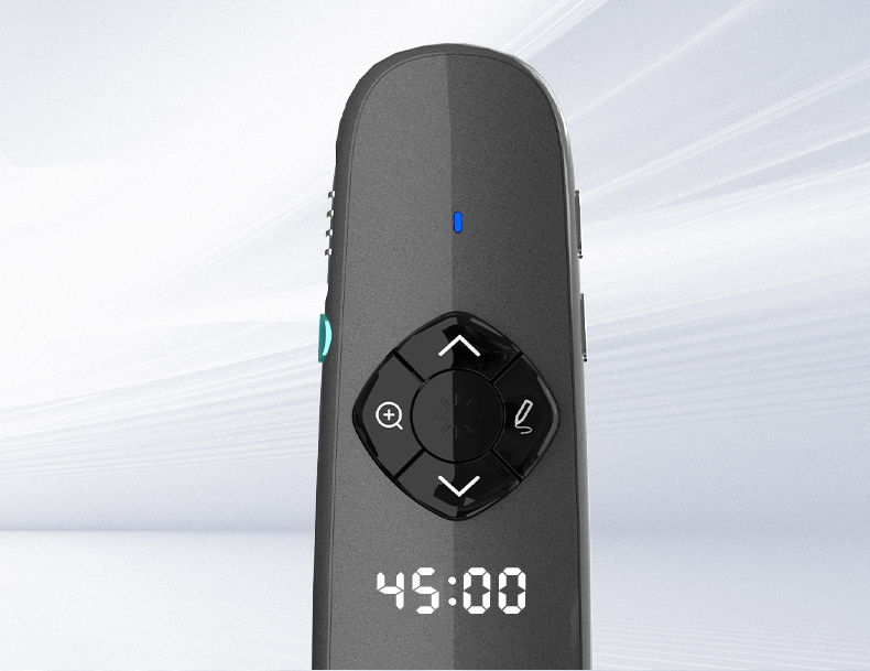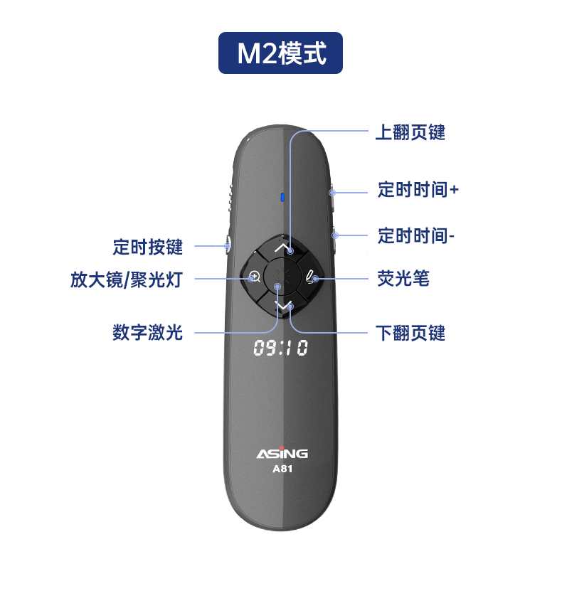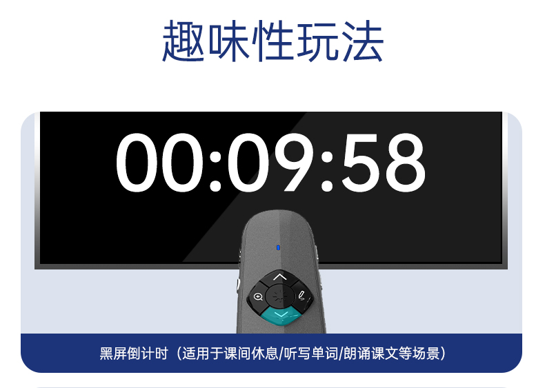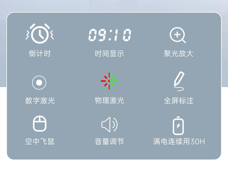 产品功能包括:自带时间显示/一键设置倒计时/放大镜/聚光灯/划线标注/数字物理双激光/空中飞鼠(左右键)/黑屏倒计时/上下翻页键按键自定义/百米远控翻页/全屏黑屏等