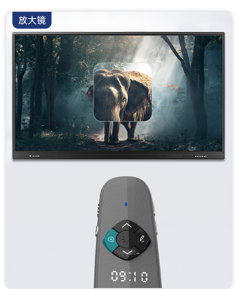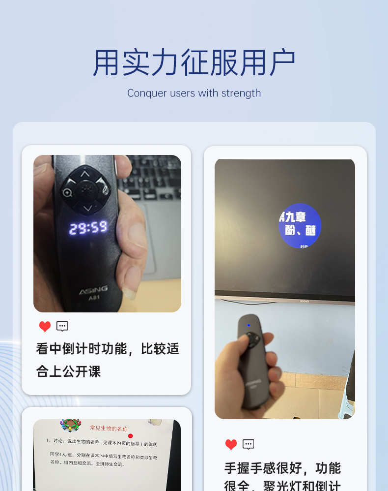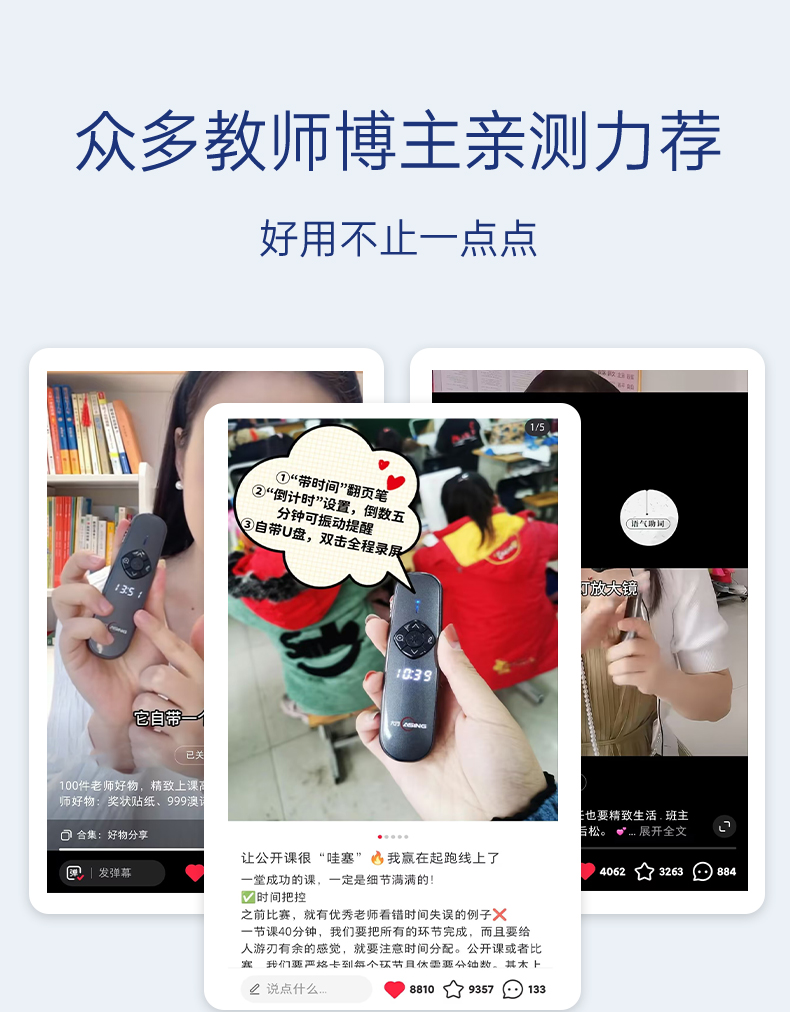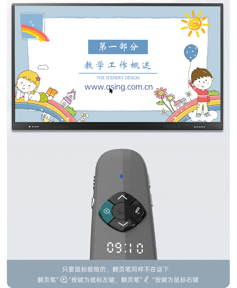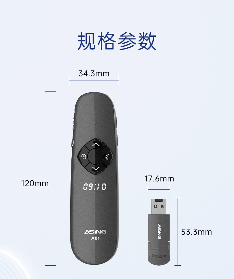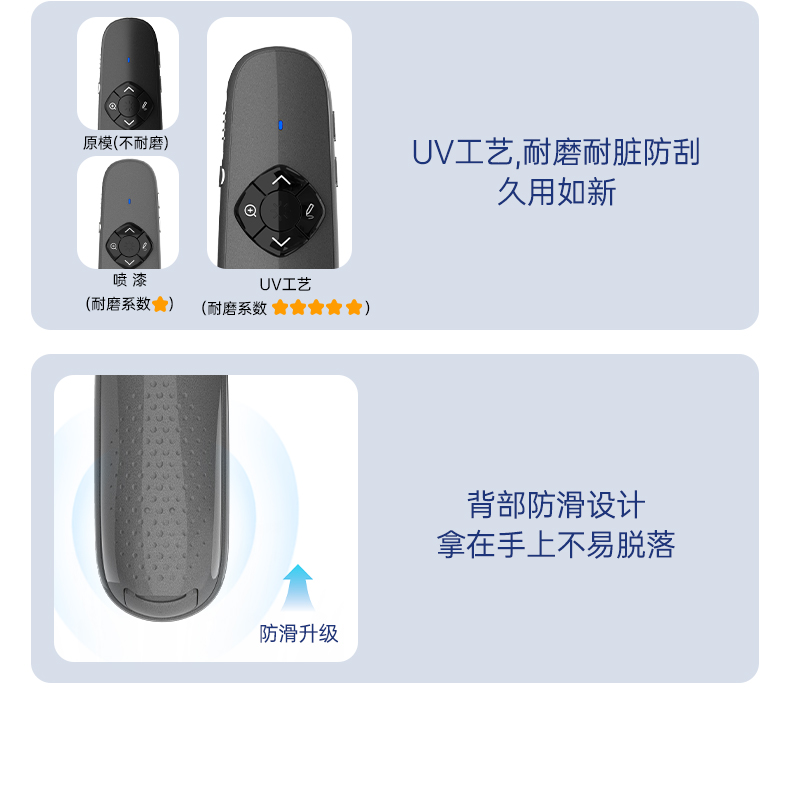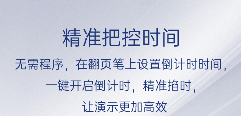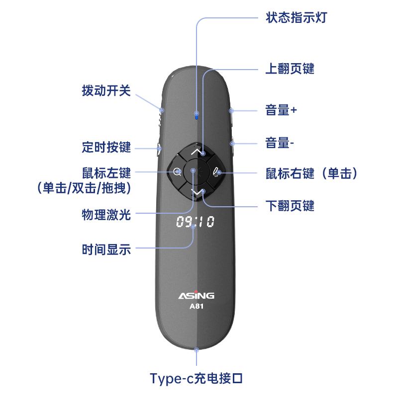 产品功能包括:自带时间显示/一键设置倒计时/放大镜/聚光灯/划线标注/数字物理双激光/空中飞鼠(左右键)/黑屏倒计时/上下翻页键按键自定义/百米远控翻页/全屏黑屏等