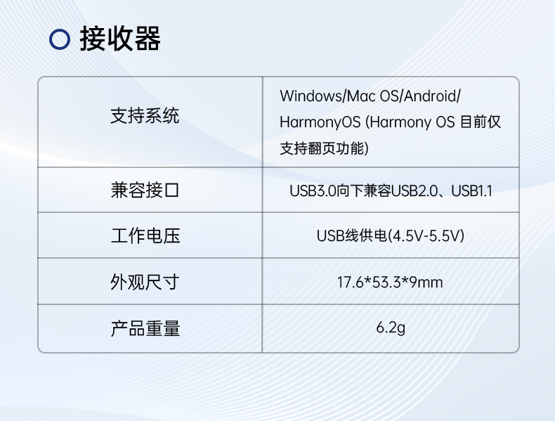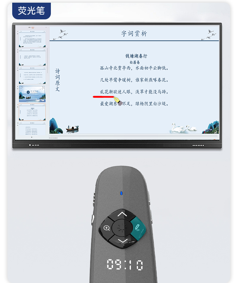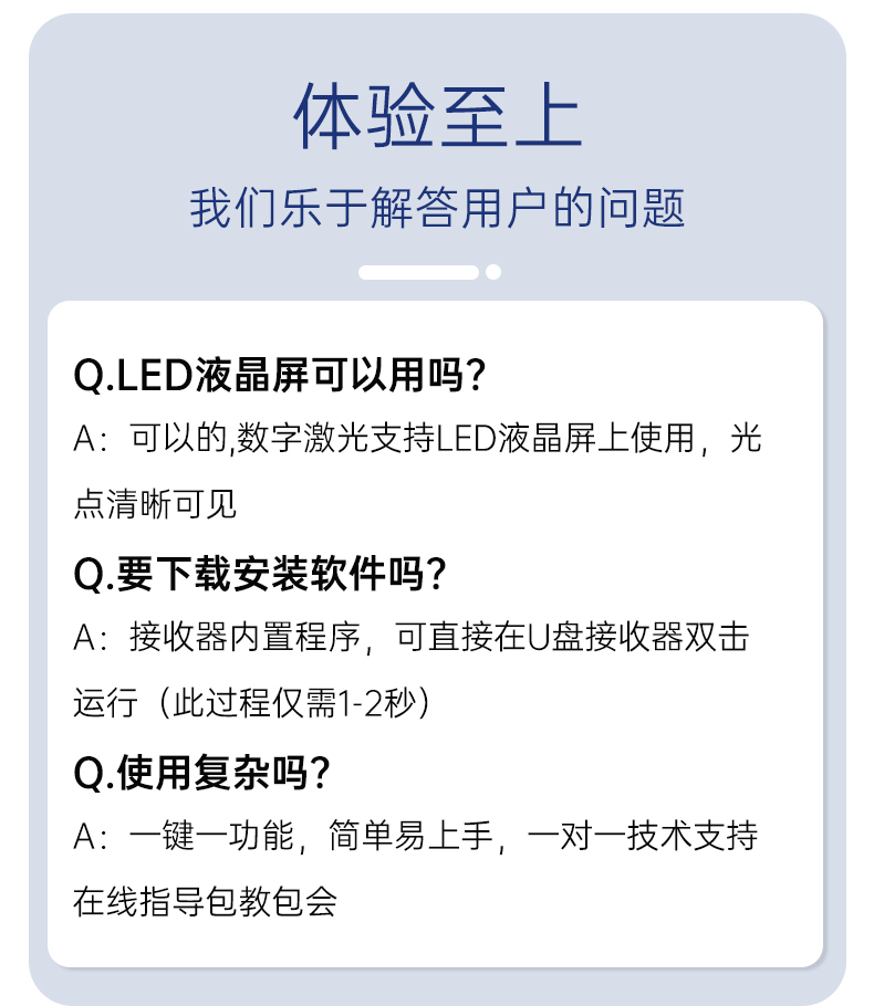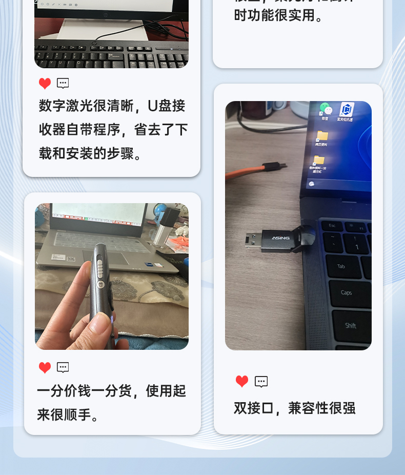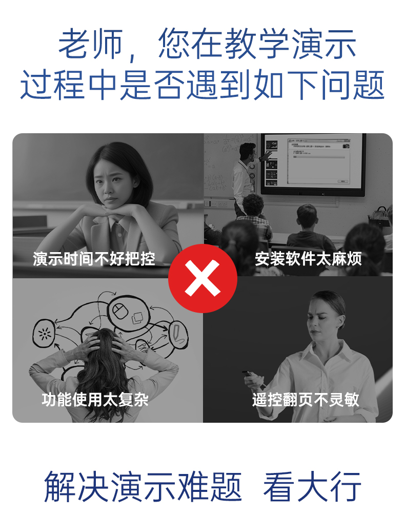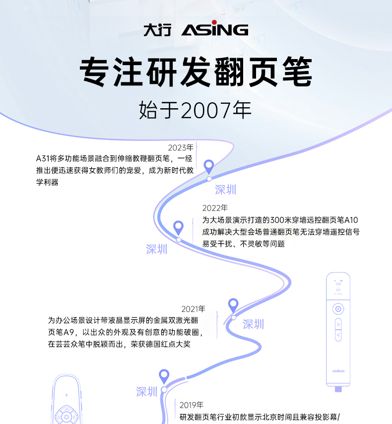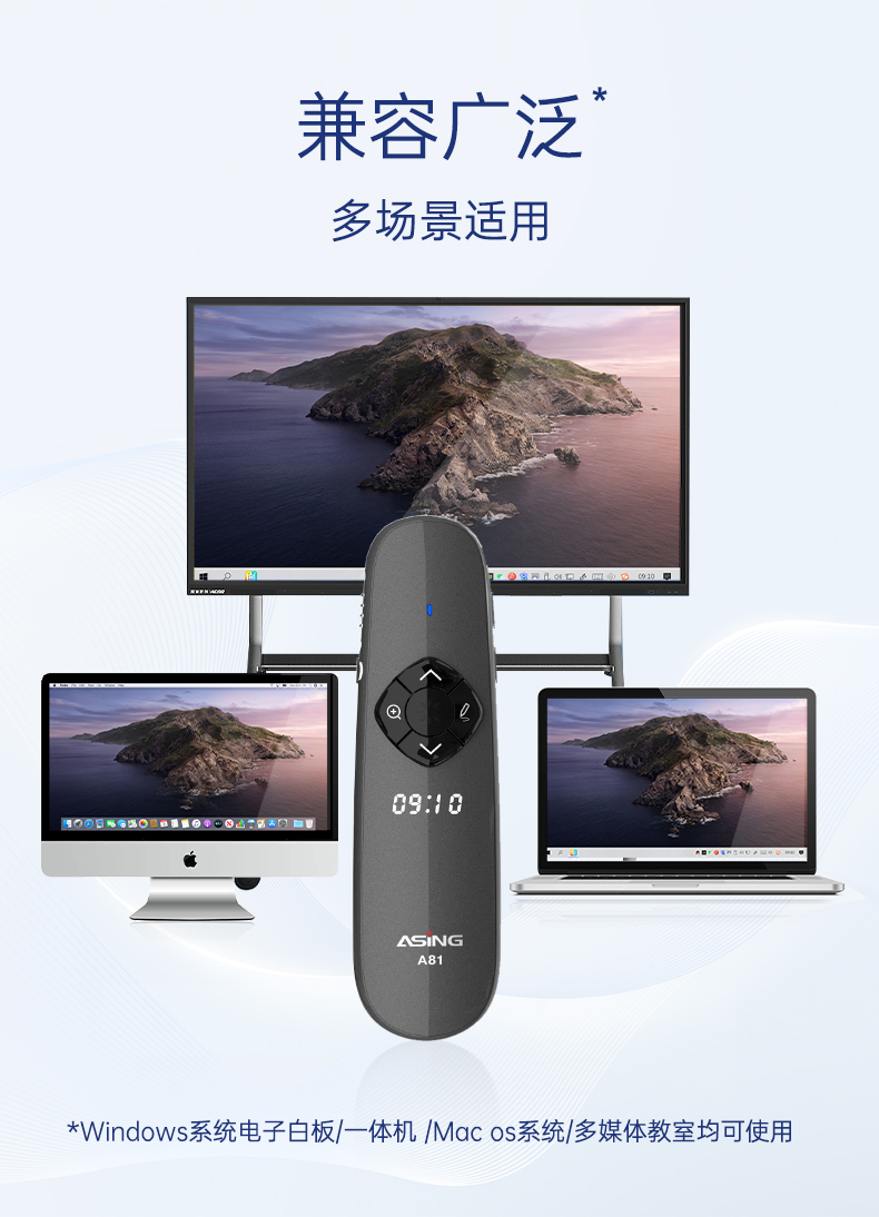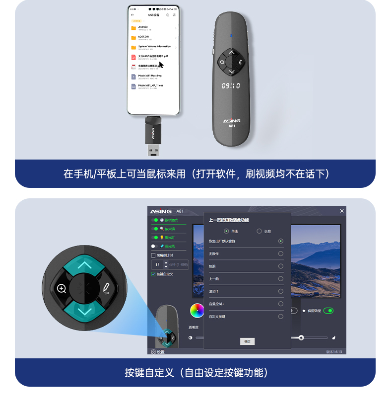 产品功能包括:自带时间显示/一键设置倒计时/放大镜/聚光灯/划线标注/数字物理双激光/空中飞鼠(左右键)/黑屏倒计时/上下翻页键按键自定义/百米远控翻页/全屏黑屏等